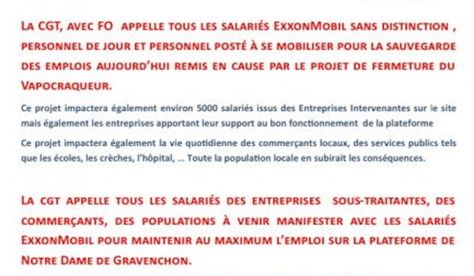 Vous le savez, les dirigeants de la multinationale américaine EXXON ont décidé de fermer l'usine vapocraqueur de Gravenchon au plus tard en octobre, laissant sur le carreau 677 salarié.e.s directement concerné.e.s, mais l'impact, avec les sous-traitants, les production "amont" et "aval", les commerces, les services publics, la culture est estimé à près de 5.000 emplois pouvant disparaître sur un bassin économique et d'emplois qui deviendrait de fait sinistré, et qui laisserait planer le doute sur les entreprises restantes, comme par exemple la raffinerie qui pourrait aussi disparaître dans les 5 ans.